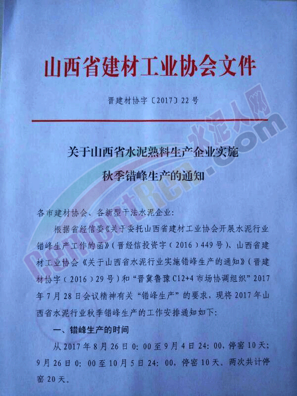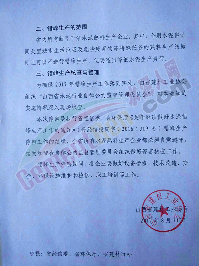 本次停窯是執(zhí)行山西省經(jīng)信委、環(huán)保廳《關(guān)于繼續(xù)做好水泥錯(cuò)峰生產(chǎn)工作的通知》(晉經(jīng)信投資字(2016)319號(hào))錯(cuò)峰生產(chǎn)停窯工作的繼續(xù),山西全省所有水泥熟料生產(chǎn)企業(yè)都必須自覺遵守,接受和配合自律公約監(jiān)督管理委員會(huì)組織做好停窯核查工作。