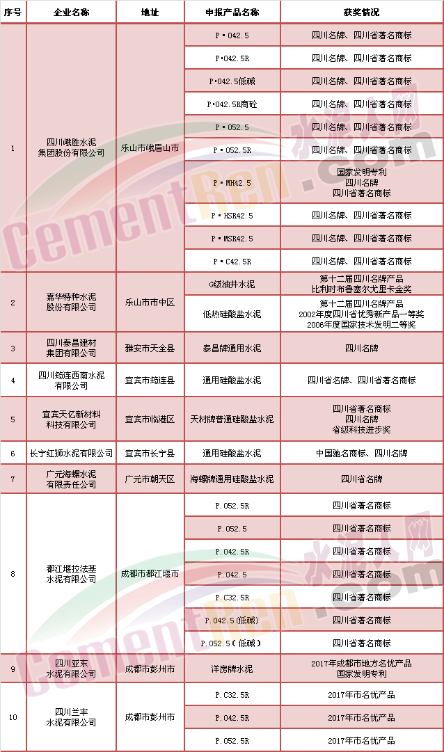 四川省省級名優(yōu)水泥產(chǎn)品匯總表