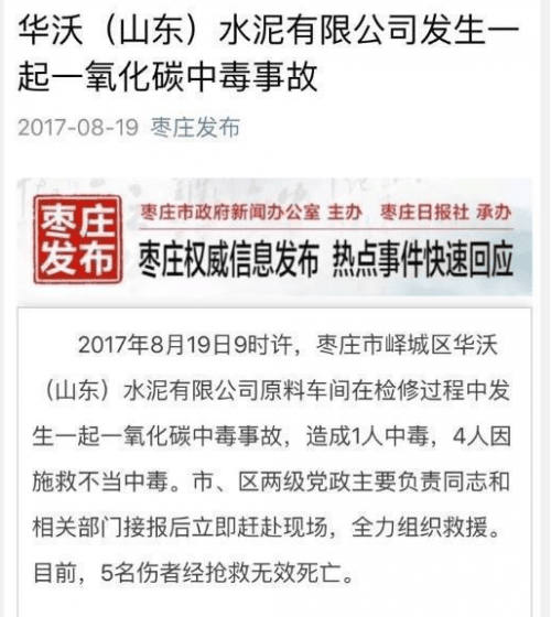 19日上午,嶧城區(qū)宣傳部發(fā)布通稿稱,2017年8月19日9時(shí)許,棗莊市嶧城區(qū)華沃(山東)水泥有限公司原料車(chē)間在檢修過(guò)程中發(fā)生一起一氧化碳中毒事故,造成1人中毒,4人因施救不當(dāng)中毒。