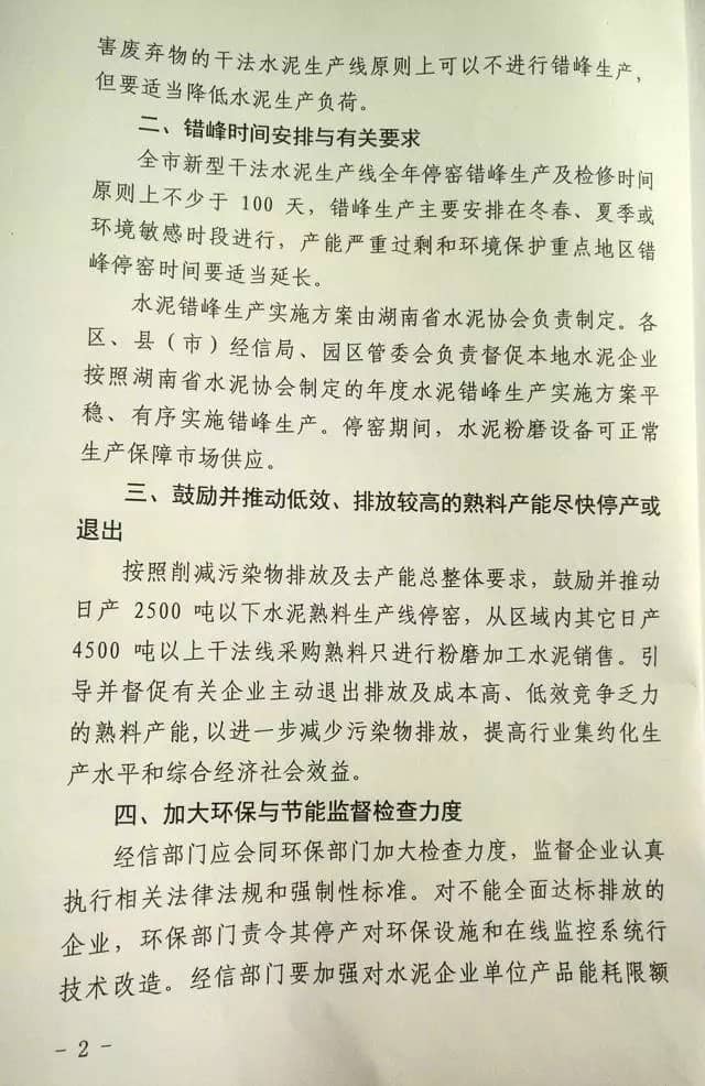 1、根據(jù)湖南全省水泥行業(yè)的過剩程度、污染物防治排放要求與各企業(yè)熟料產(chǎn)能能耗、效率等實(shí)際情況,全省新型干法熟料生產(chǎn)線全年按70%的運(yùn)轉(zhuǎn)時(shí)間計(jì)算,折合每條生產(chǎn)線停窯時(shí)間為110天,其中一季度40天(除衡陽(yáng)、永州停窯35天外),二季度25天,三季度25天,四季度20天。