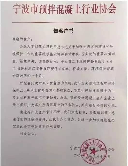 而就在環(huán)保督察組進駐一周的時間,寧波市預(yù)拌混凝土行業(yè)協(xié)會發(fā)布《發(fā)客戶書》,稱為配合環(huán)保督查為契機,寧波市及周邊地區(qū)石礦因環(huán)保整治,基本都處于停產(chǎn)整頓狀態(tài),導(dǎo)致生產(chǎn)預(yù)拌混凝土的主要原材料石子供應(yīng)嚴重缺貨。為此,寧波市預(yù)拌混凝土生產(chǎn)企業(yè)無法保證混凝土的正常供應(yīng),并有隨時停供的可能!