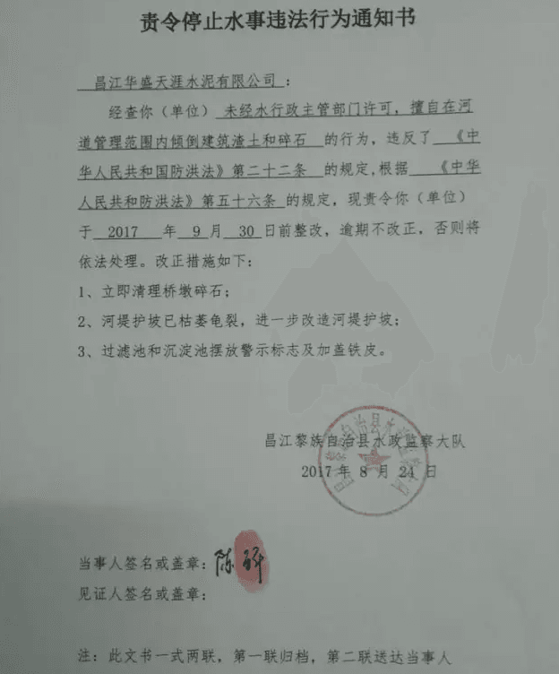 聯(lián)合執(zhí)法部門嚴肅責令華盛水泥廠接受二次《責令停止水事違法行為通知書》,要求華盛水泥廠在2017年9月30日前必須整改以下三點問題:一、立即清理橋墩碎石;二、沉淀池及過濾池須加蓋鐵皮及擺放警示標志;三、河堤護坡已枯萎龜裂,為防止汛期雨水將泥塊沖刷入河,必須限期改造成菱形網(wǎng)格植被護坡。若限期整改效果未達到《責令停止水事違法行為通知書》所要求標準,則依法接受行政處罰。