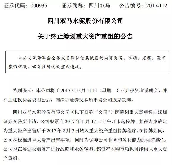 另外,記者了解到,2017年9月11日四川雙馬還將以網(wǎng)絡互動方式召開投資者說明會,就公司終止籌劃重大資產(chǎn)重組相關情況與投資者進行互動交流和溝通。