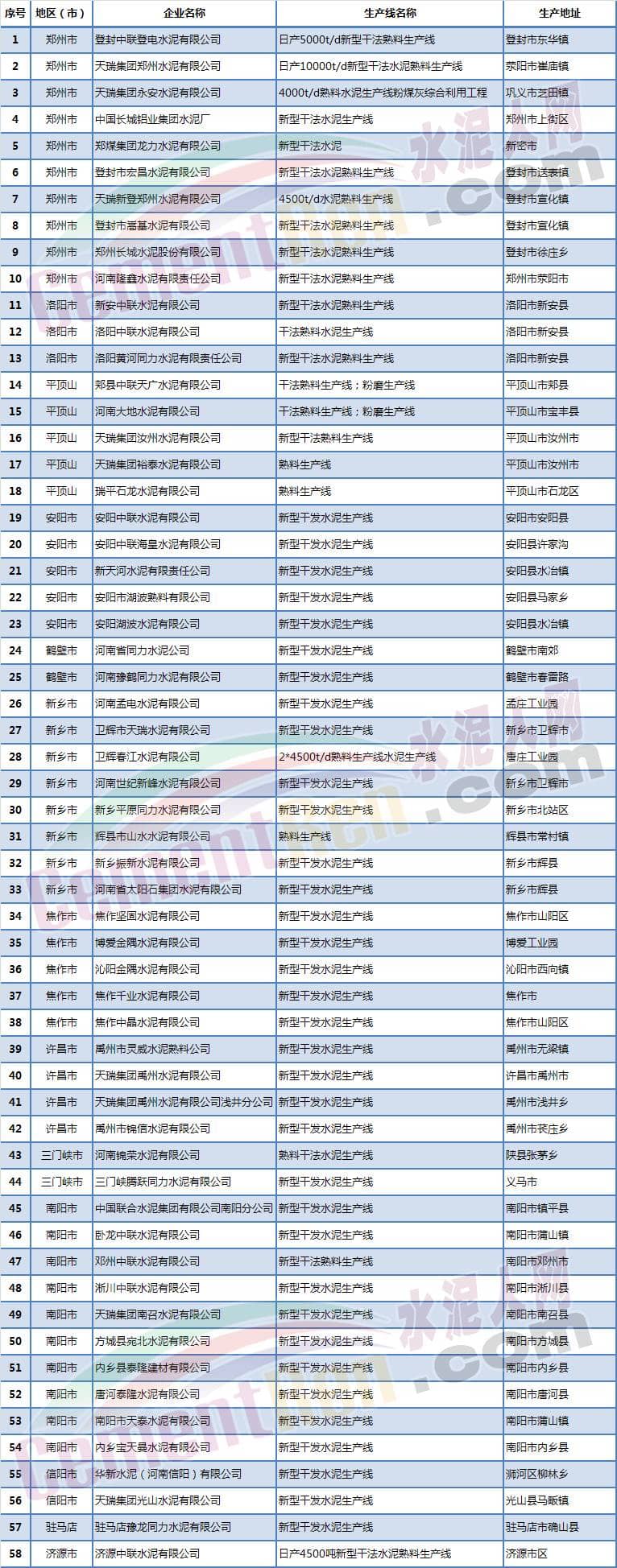 今年年初河南省工信委發(fā)布的河南省水泥行業(yè)產(chǎn)能現(xiàn)狀清單顯示河南省共有58家熟料干法水泥生產(chǎn)線(不包括特種水泥生產(chǎn)線)。