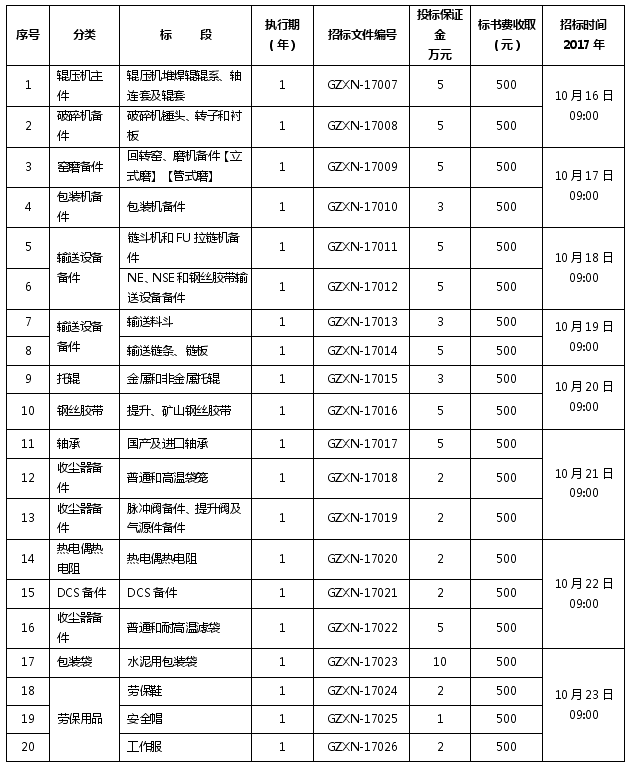 貴州西南水泥有限公司是西南水泥有限公司下屬子公司,于2012年3月21日成立。貴州西南水?dāng)M定于2017年10月中旬對下屬26家成員企業(yè)2018年度輔材備件進(jìn)行集中招標(biāo),通過邀請招標(biāo)選擇資質(zhì)合格、保供能力強(qiáng)、質(zhì)量及技術(shù)服務(wù)均受控的供貨單位?,F(xiàn)將相關(guān)招標(biāo)采購信息發(fā)布如下: