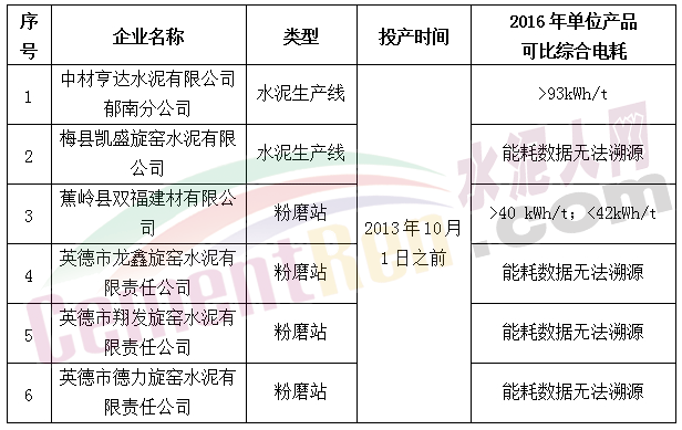 根據(jù)核查及復(fù)核結(jié)果,6家水泥企業(yè)產(chǎn)品可比綜合電耗超過國家限額標(biāo)準(zhǔn)或能耗數(shù)據(jù)無法溯源,現(xiàn)將6家企業(yè)名單及其2016年單位產(chǎn)品可比綜合電耗核查情況予以公布。