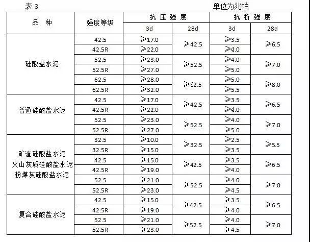 不同品種不同強(qiáng)度等級的通用硅酸鹽水泥,其不同齡期的強(qiáng)度應(yīng)符合表3的規(guī)定。
