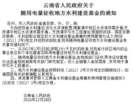 云南省政府2016年12月28日文件《云南省人民政府關(guān)于隨用電量征收地方水利建設(shè)基金的通知》(云政發(fā)〔2016〕108號),以及火電補貼基金,加上滇中飲水工程使得金沙江上游水直接引入滇中區(qū)域,金沙江中下游水量降低,水電發(fā)電量也會下降,以上都將導(dǎo)致水泥行業(yè)生產(chǎn)電力成本上漲(每月達幾百萬甚至上千萬元)。