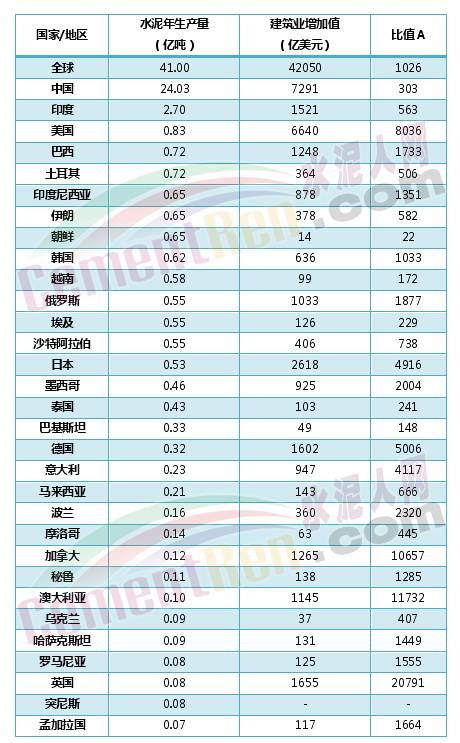 我們把世界各國(guó)中水泥年產(chǎn)量在700萬(wàn)噸以上的國(guó)家的水泥產(chǎn)量(能找到的最新數(shù)據(jù),大部分?jǐn)?shù)據(jù)為2015、2016年,見(jiàn)附表1)、建筑業(yè)增加值(2014年數(shù)據(jù))列出來(lái),然后用建筑業(yè)增加值(單位億美元)比水泥年產(chǎn)量(單位億噸),得到了下面的數(shù)據(jù)(嚴(yán)格來(lái)說(shuō),我們應(yīng)該取同一年份的數(shù)據(jù)來(lái)計(jì)算比值,但確實(shí)小編能獲取到的數(shù)據(jù)有限,2014-2016年這幾項(xiàng)數(shù)據(jù)應(yīng)該來(lái)說(shuō)并沒(méi)有大的波動(dòng),所以我們?nèi)钥梢酝ㄟ^(guò)比值看到大的趨勢(shì)和特征),按照水泥年產(chǎn)量來(lái)進(jìn)行排序: