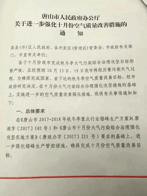 昨日(11日),唐山市人民政府辦公廳發(fā)布關(guān)于進一步強化十月份空氣質(zhì)量改善措施的通知(以下簡稱“通知”)。