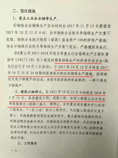 通知要求《唐山市2017-2018年秋冬季重點行業(yè)錯峰生產(chǎn)方案》(唐政字[2017]101號)規(guī)定的需要錯峰生產(chǎn)的所有行業(yè)企業(yè),于2017年10月12日0時至2017年10月31日24時期間提前執(zhí)行相應(yīng)的錯峰生產(chǎn)措施,按照規(guī)定可免于停限產(chǎn)的企業(yè),未經(jīng)市政府批準或備案的,一律不得免于停限產(chǎn)。