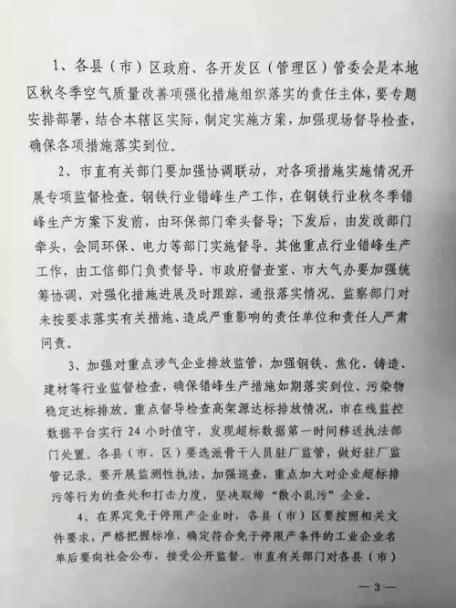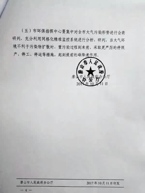 通知稱之所以提前啟動錯峰生產(chǎn)是因為十月份唐山市完成秋冬季大氣污染綜合治理攻堅目標形勢嚴峻,且經(jīng)預(yù)測10月13日、19日唐山市將經(jīng)歷重污染天氣過程。為確保完成國家、省下達的秋冬季空氣質(zhì)量改善目標,經(jīng)唐山市政府研究決定,在十月份大氣污染綜合治理強化攻堅措施的基礎(chǔ)上,實施進一步的空氣質(zhì)量改善強化措施。