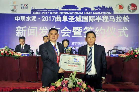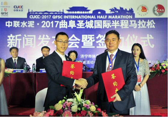 隨后,北京初美體育文化發(fā)展有限公司總經理吳宇熙與中國聯合水泥集團有限公司總經理、黨委副書記孫建成簽約。中國聯合水泥集團有限公司正式成為2017曲阜圣城國際半程馬拉松的獨家冠名商。濟寧市體育局副局長邵波為冠名贊助商中國聯合水泥集團有限公司授牌。賽事獨家冠名商中國聯合水泥集團有限公司總經理、黨委副書記孫建成致辭。
