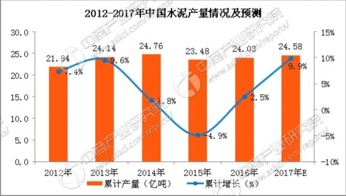 據(jù)中商產(chǎn)業(yè)研究院發(fā)布的《2017-2022年中國水泥行業(yè)市場前景及投資機會研究報告》數(shù)據(jù)統(tǒng)計顯示,2016年中國水泥累計產(chǎn)量為24.03億噸,累計增長2.5%;預(yù)計2017年中國水泥累計產(chǎn)量將達24.58億噸,累計增長約9.9%。據(jù)最新數(shù)據(jù)統(tǒng)計顯示,2017年9月中國水泥產(chǎn)量2.2億噸,同比下滑2%;2017年1-9月中國水泥產(chǎn)量17.6億噸,同比下滑0.5%。