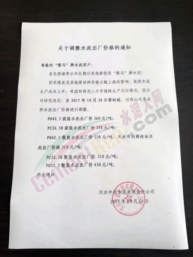 調(diào)價通知稱:因受煤炭及其他原材料價格大幅上漲的影響,致使水泥生產(chǎn)成本上升,考慮即將進入冬季生產(chǎn)實際情況,經(jīng)研究決定自今日(30日)零時起,對公司各品種水泥出廠價格進行調(diào)整。