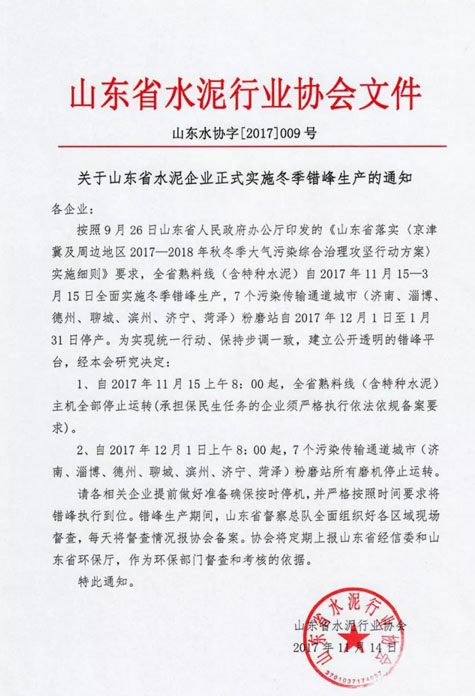 同日,山東省水泥協(xié)會(huì)發(fā)布《關(guān)于山東省水泥企業(yè)正式實(shí)施冬季錯(cuò)峰生產(chǎn)的通知》,該通知明確規(guī)定: