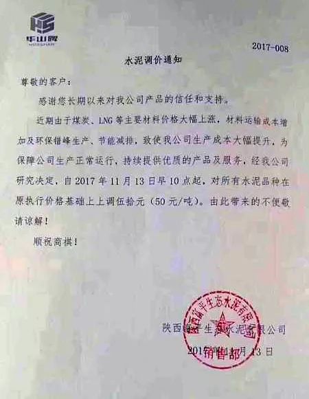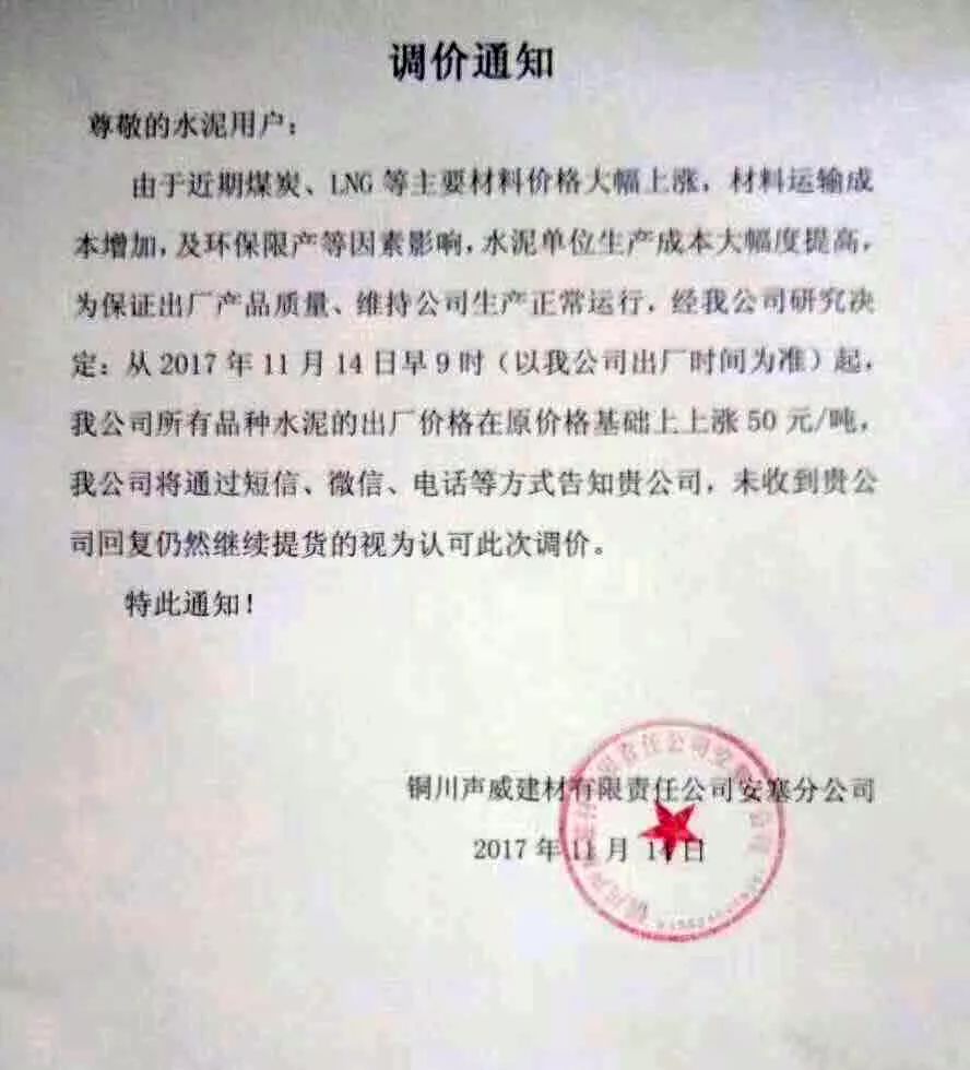銅川聲威建材有限責任公司安塞分公司調(diào)價通知稱:由于近期煤炭、LNG等主要材料價格大幅上漲,材料運輸成本增加,環(huán)保限產(chǎn)等因素影響,水泥單位生產(chǎn)成本大幅度提高,為保證出廠產(chǎn)品質(zhì)量、維持公司生產(chǎn)正常運行,經(jīng)我公司研究決定:從2017年11月14日早9時起對公司所有品種水泥的出廠價格在原基礎(chǔ)上上漲50元/噸。