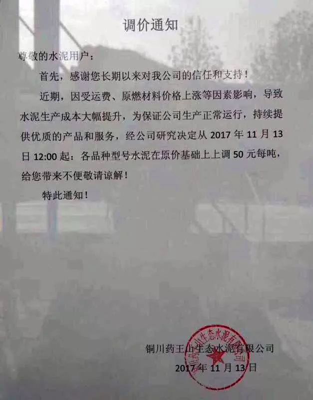 銅川藥王山生態(tài)水泥有限公司調(diào)價通知稱,因受運費、原材料,燃料價格上漲等因素影響,導致水泥生產(chǎn)成本大幅度提升,為保證公司生產(chǎn)正常運行,持續(xù)提供優(yōu)質(zhì)的產(chǎn)品和服務,經(jīng)公司研究決定從2017年11月13日12:00起,各品種型號水泥在原價基礎(chǔ)上上調(diào)50元/噸。