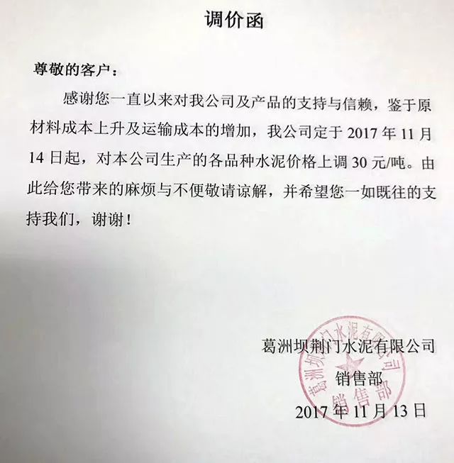同期,受周邊區(qū)域水泥提價的影響,近日湖北省區(qū)域內(nèi)多家企業(yè)發(fā)布提價通知消息,其中葛洲壩荊門水泥有限公司調(diào)價函稱,鑒于原材料成本上升及運輸成本的增加,公司定于2017年11月14日起對公司生產(chǎn)的各品種水泥價格上調(diào)30元/噸。