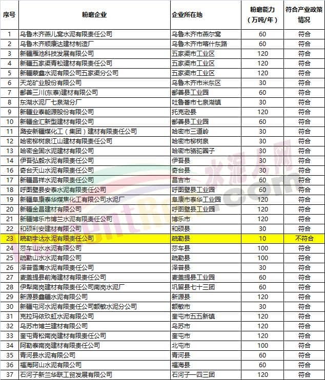 新疆水泥粉磨企業(yè)產(chǎn)能現(xiàn)狀清單