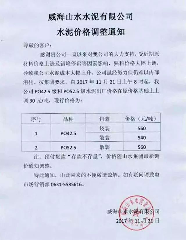 【水泥人網(wǎng)】近日,山東省的水泥熟料價格大漲,多家企業(yè)通知下游客戶價格上調(diào)。其中威海山水水泥有限公司水泥價格調(diào)整通知稱,受近期原材料價格上漲及錯峰停窯因素影響,熟料價格大幅上調(diào),導致公司水泥成本大幅上升。公司雖經(jīng)努力但仍難以內(nèi)部消化。按集團要求自2017年11月21日上午8時起,PO42.5級和PO52.5級水泥出廠價格在原價格基礎(chǔ)上上調(diào)30元/噸。現(xiàn)行價格PO42.5水泥袋裝價格560元/噸,散裝價格540元/噸。PO52.5散裝水泥560元/噸。