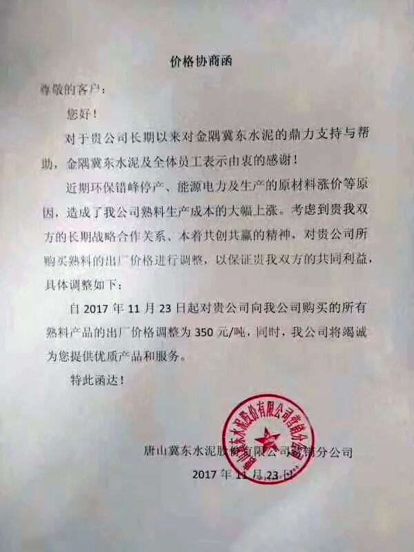 河北省主導企業(yè)唐山冀東水泥于昨日發(fā)布了熟料價格協(xié)商函,《價格協(xié)商函》稱因近期環(huán)保錯峰停產(chǎn)、能源電力及生產(chǎn)的原材料漲價等原因,造成了公司熟料生產(chǎn)成本的大幅上漲。考慮到長期戰(zhàn)略合作關(guān)系,本著共贏的精神,自23日起熟料出廠價格上調(diào)為350元/噸 。
