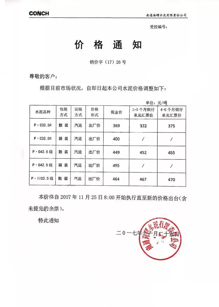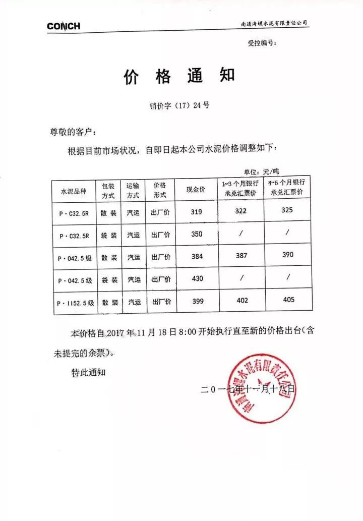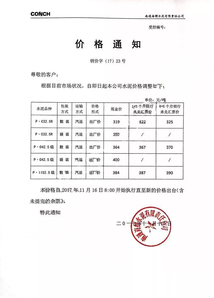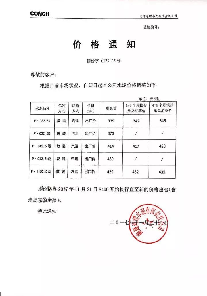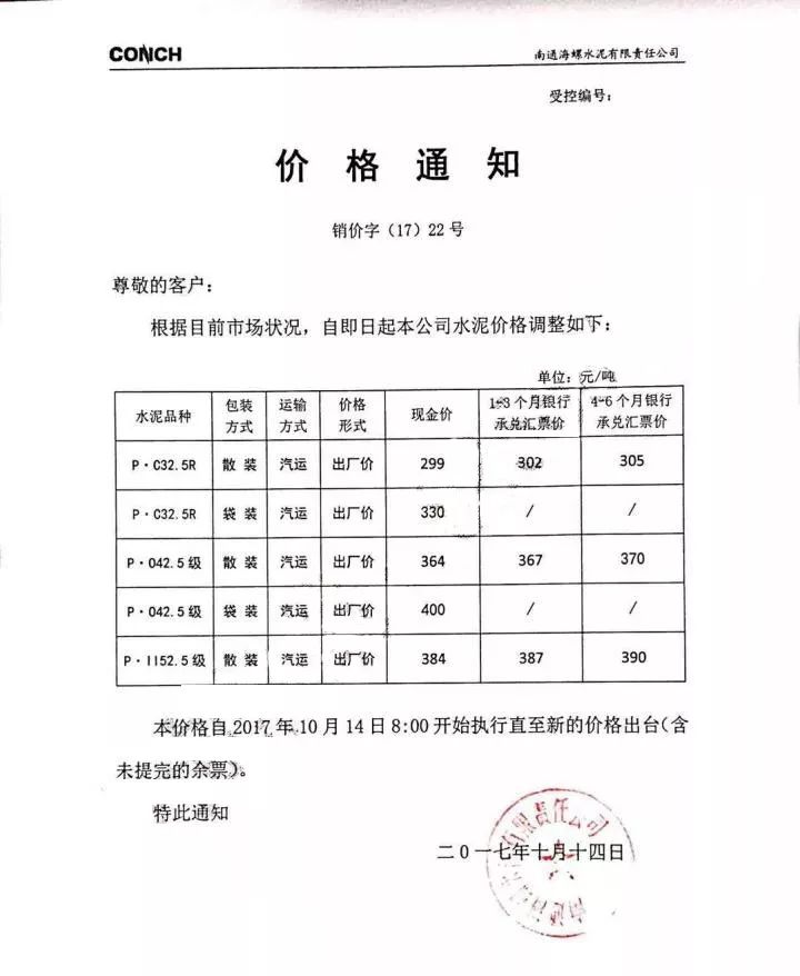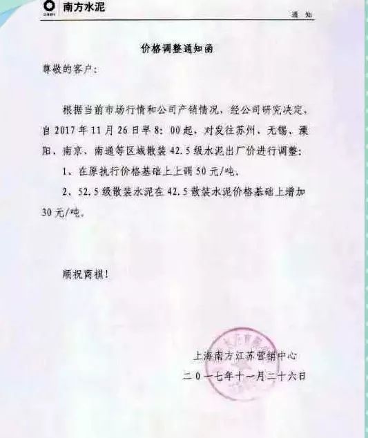 南通海螺水泥漲價(jià)函