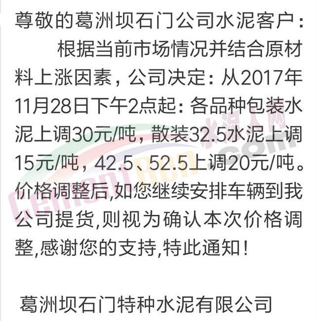 8 葛洲壩松滋水泥漲價(jià)通知