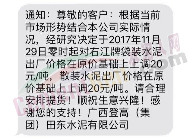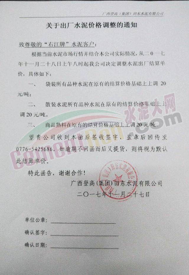 23登高集團(tuán)田東水泥漲價(jià)函