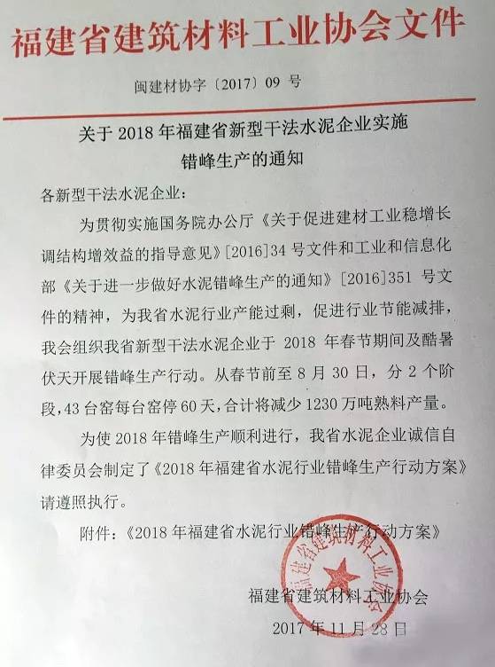通知稱,為貫徹實施國務院辦公室廳《關于促進建材工業(yè)穩(wěn)增長調結構增效益的指導意見》的精神,為福建省水泥行業(yè)產能過剩,促進行業(yè)節(jié)能減排,福建省建筑材料工業(yè)協(xié)會將組織省內新型干法水泥企業(yè)于2018年春節(jié)期間及酷暑伏天開展錯峰生產行動。
