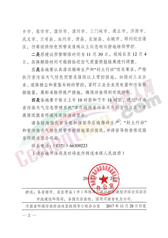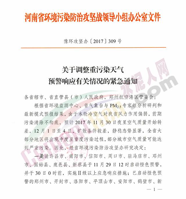 自水泥人網(wǎng)10月30日發(fā)布《河南省七十四家水泥企業(yè)停限產(chǎn)方案(含特種水泥名單)》(點(diǎn)擊閱讀)后,河北省多區(qū)域水泥企業(yè)也將再現(xiàn)集體停產(chǎn)。河南省環(huán)境污染防治攻堅(jiān)戰(zhàn)領(lǐng)導(dǎo)小組辦公室于近日發(fā)布《關(guān)于調(diào)整重污染天氣預(yù)警響應(yīng)有關(guān)情況的緊急通知》稱:根據(jù)河南省環(huán)境監(jiān)測(cè)中心、省氣象臺(tái)與PM2.5專家組分析研判和最新模式預(yù)報(bào)結(jié)果,預(yù)計(jì)2017年11月30日夜里空氣質(zhì)量開(kāi)始轉(zhuǎn)差,12月1日至4日,擴(kuò)散條件較差,靜穩(wěn)態(tài)勢(shì)顯著,全省大部分地區(qū)將出現(xiàn)中度至重度污染過(guò)程,部分城市空氣質(zhì)量可能達(dá)到嚴(yán)重污染。因此,經(jīng)省環(huán)境污染防治攻堅(jiān)辦研究決定: