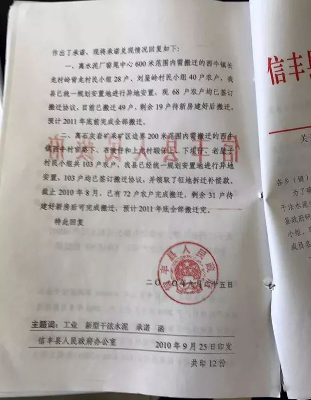 未按2007年3月14日發(fā)文的承諾書要求兌現(xiàn)海螺水泥(原圣塔水泥)一期環(huán)評驗收專家組要求的600米衛(wèi)生防護距離范圍內(nèi)的房屋搬遷工作,又未按2010年9月25日信府文【2010】114號承諾書復(fù)函上的承諾2011年底完成全部搬遷工作,在未按要求兌現(xiàn)之前承諾的前提下又違規(guī)默許海螺水泥新建二期生產(chǎn)線。時至今日,海螺水泥二期工程掛著試生產(chǎn)的名義大規(guī)模生產(chǎn)幾年了,可一、二期的衛(wèi)生防護距離范圍內(nèi)居民搬遷工作一直未落實;