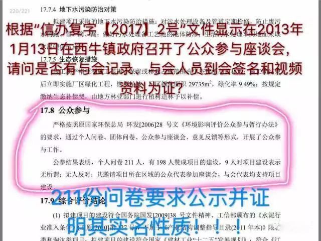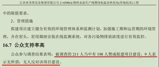 衛(wèi)生防護距離包絡(luò)圖未按國家標準的以污染源為中心點,以防護距離為半徑作圓形輻射包絡(luò)。而是畫成了矩形圖案,”巧妙”的規(guī)避了本應(yīng)在防護距離范圍內(nèi)的一些敏感點民宅。環(huán)評報告書中的公眾參與人數(shù)前后不一致:2013年4月江西省圣塔實業(yè)集團有限公司2x4500t/d熟料生產(chǎn)線暨純低溫余熱發(fā)電(異地技改)工程環(huán)境影響評價報告書中的”15.3公眾參與調(diào)查結(jié)果統(tǒng)計與分析一文的第(2)條寫出發(fā)放調(diào)查問卷211份,收回問卷211份,回收率100%”。可是在接下來的16.7公眾支持率高里卻出現(xiàn)了”被調(diào)查的211人當中有198人贊成擬建項目建設(shè),9人表示無所謂,無人反對該項目建設(shè)”,可是198+9=207人,剩下4人不見其蹤;