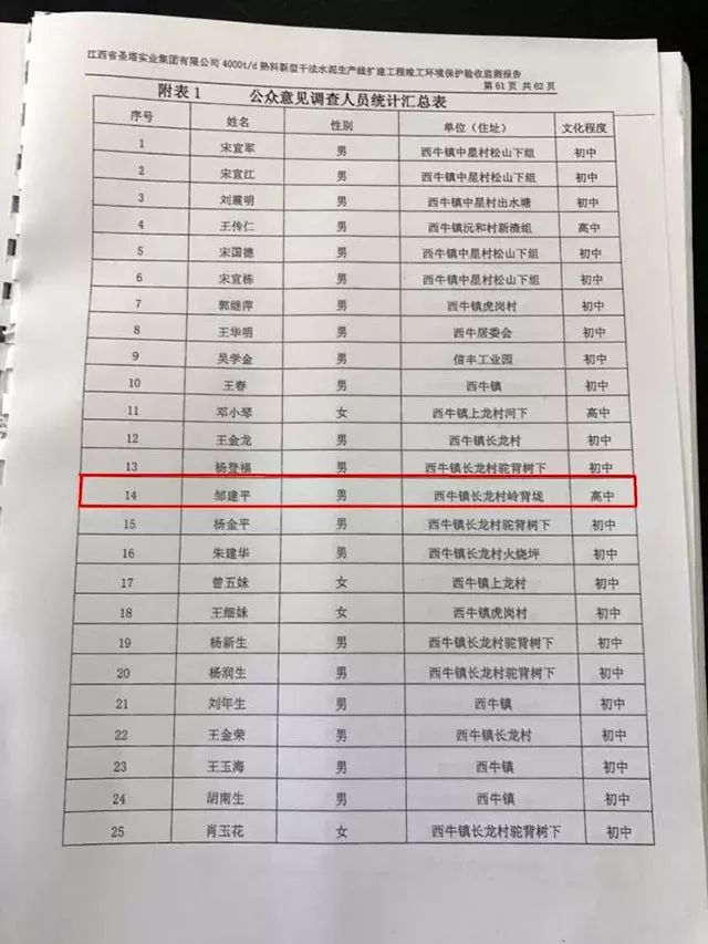 公參人員不真實,當?shù)卦S多村民未接到任何電話核實和調(diào)查表。比如鄒先生的小兒子鄒建平,當時他并未在信豐工作,也并未收到任何電話或書面的調(diào)查與意見詢問,可在企業(yè)的環(huán)評報告書中的公參人員意見表中卻赫然寫著鄒建平的名字;