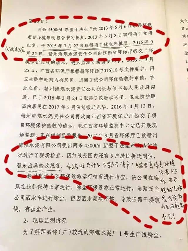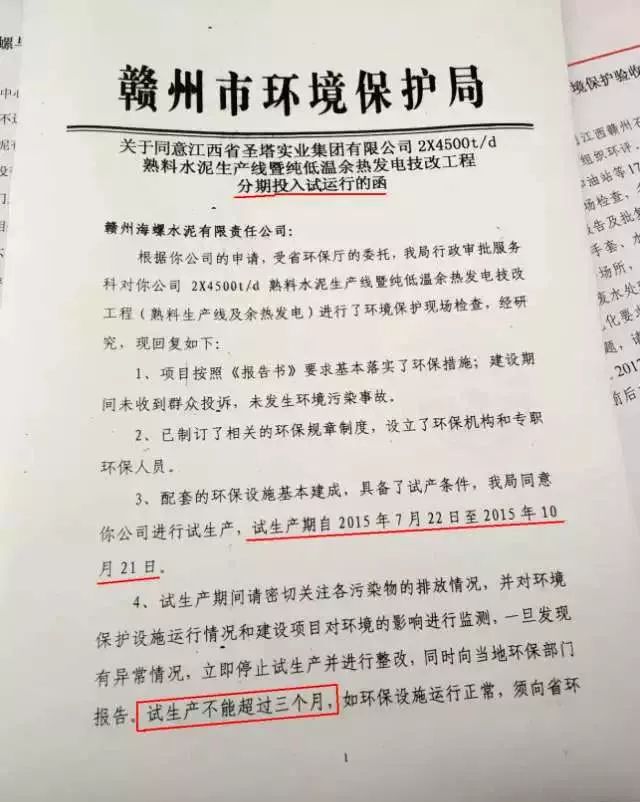 在海螺水泥未依法取得環(huán)評驗收前,默許其違規(guī)生產(chǎn)達2年之久(贛州市環(huán)保局2015年7月22日發(fā)的試運行函:試生產(chǎn)期自2015年7月22日至2015年10月21日,試生產(chǎn)期不能超過三個月),縱容企業(yè)”久試未驗”的事實。麻痹對待對信訪群眾,相關(guān)資料不依法公示(村民依法寫了申請公示不給查看)、投訴信訪回復(fù)的數(shù)據(jù)和文字漏洞百出;