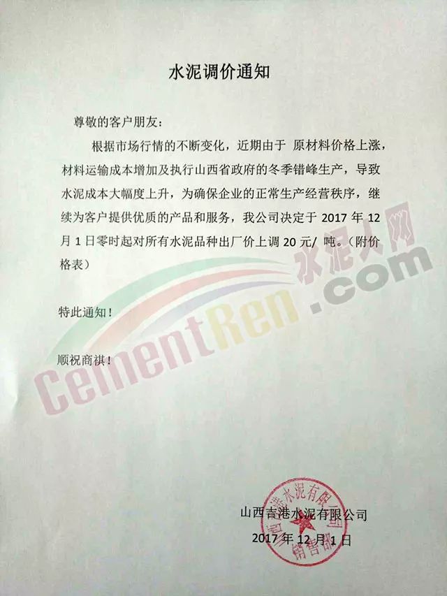 根據(jù)當前市場形勢及我司生產情況,我公司決定于2017年12月1日上午8:00上調PC32.5R袋、散,PO42.5袋、散水泥價格20元/噸,價格上調以我司出廠過磅時間為準,如您繼續(xù)安排提貨,則視為認同此次價格調整。順祝商祺!