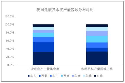 區(qū)域分布與危廢產區(qū)高度匹配:水泥在是傳統(tǒng)意義上的“短腿”產品,業(yè)內普遍認為其經濟銷售半徑為公路<300公里、鐵路<500公里。因此水泥產能的密度與當?shù)亟洕l(fā)展水平和基建需求直接相關。同時,危廢來自工業(yè)生產過程,同樣與經濟發(fā)展水平相關。如下圖所示,水泥產能分布與危廢產量分布情況區(qū)域匹配度整體較高。因此,水泥窯協(xié)同處置工藝的區(qū)域適用性較強,適于在全國范圍內推廣,作為普適的協(xié)同處置技術,填補全國各地傳統(tǒng)危廢產能供需缺口。
