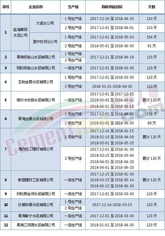 1 一般水泥生產(chǎn)線:2017年12月至2018年4月30日 連續(xù)停窯120天;