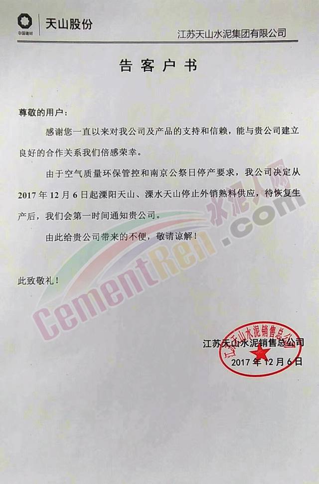 昨日,江蘇天山水泥銷售總公司發(fā)通知稱:由于空氣質(zhì)量環(huán)保管控和南京公祭日停產(chǎn)要求,公司決定從2017年12月6日起溧陽天山、溧水天山停止外銷熟料供應(yīng)。