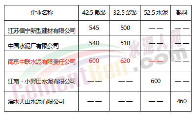 停限之后南京市本地水泥的出貨量銳減,水泥價(jià)格也出現(xiàn)一定的波動(dòng)。截止小編發(fā)稿時(shí)止,南京市主導(dǎo)企業(yè)的PC32.5水泥,PO42.5水泥報(bào)價(jià)皆在500元以上。具體報(bào)價(jià)見下表: