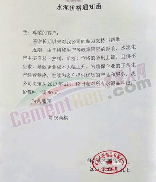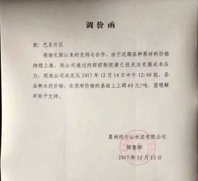 近一周,多區(qū)域企業(yè)再一次上調(diào)水泥價格,葛洲壩興山水泥有限公司日前發(fā)布調(diào)價函,對巴東片區(qū)自12月14日中午12點起,各品種水泥在原價格基礎上上調(diào)60元/噸。