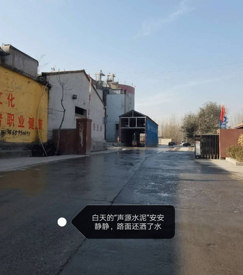 同樣也是在夜幕降臨后棗莊聲源水泥的設(shè)備也啟動(dòng)起來(lái)。就在大門口的設(shè)備生產(chǎn)的水泥通過(guò)出料口被拉散裝水泥的車直接拉走,廠區(qū)上空粉塵朦朧。白天確是一片安靜設(shè)備停著沒(méi)有聲音,地面也經(jīng)過(guò)灑水處理。