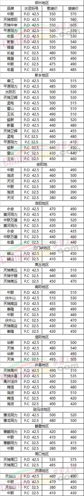 河南省部分地區(qū)水泥市場(chǎng)參考價(jià)