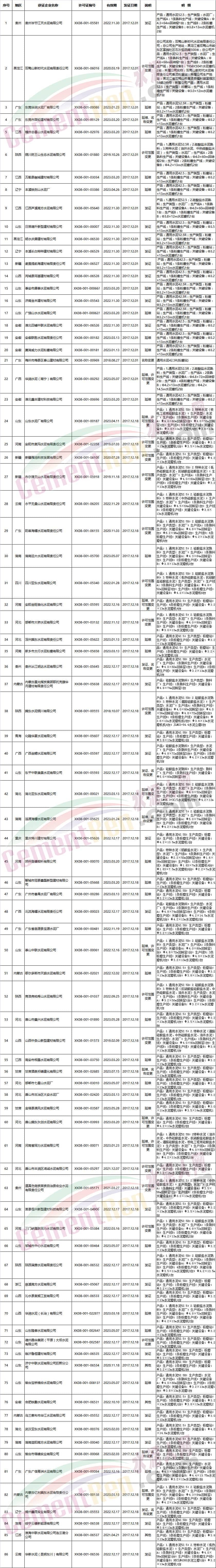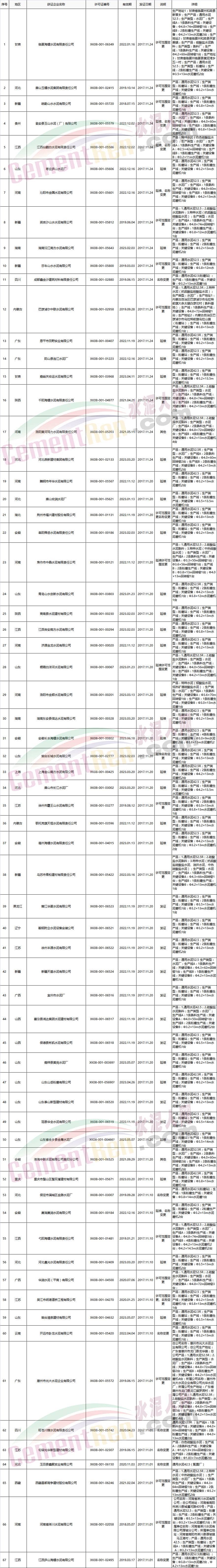 上月(11月份)質(zhì)檢部局共分三批發(fā)放水泥制造行業(yè)生產(chǎn)許可證,其中新發(fā)證9家,涉及變更的共30家,到期延續(xù)的共26家,11月份共計67家水泥企業(yè)新發(fā)、換發(fā)生產(chǎn)許可證。具體名單如下:
