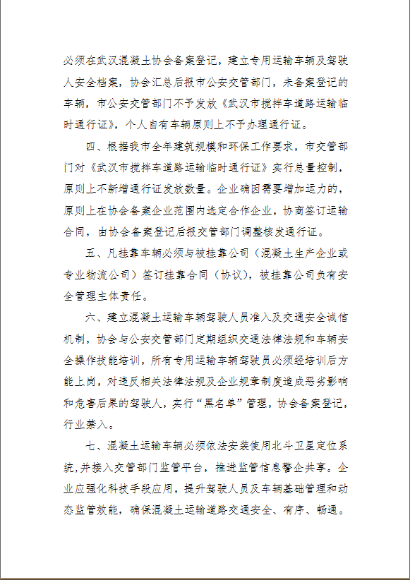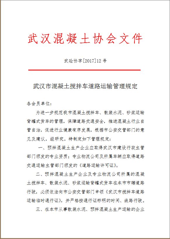 【水泥人網(wǎng)】為進(jìn)一步規(guī)范武漢市混凝土攪拌車、散裝水泥、砂漿運(yùn)輸背罐式貨車的管理,保障道路交通安全,推進(jìn)混凝土行業(yè)自管自治,促進(jìn)行業(yè)健康有序發(fā)展,武漢混凝土協(xié)會(huì)根據(jù)市公安管部門的意見及建議,經(jīng)研究,特制定《武漢市混凝土攪拌車道路運(yùn)輸管理規(guī)定》,詳情如下: