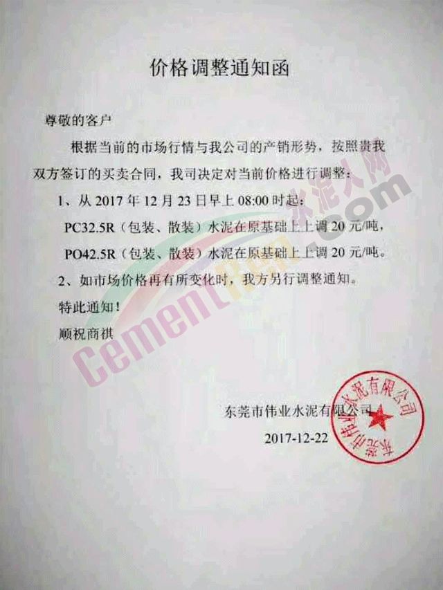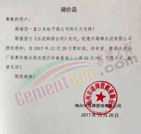 梅州市塔牌營銷有限公司調(diào)價函
