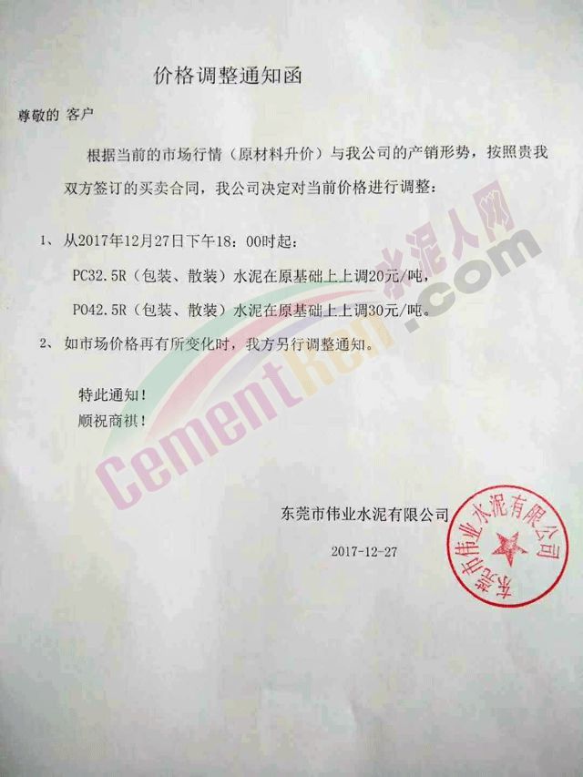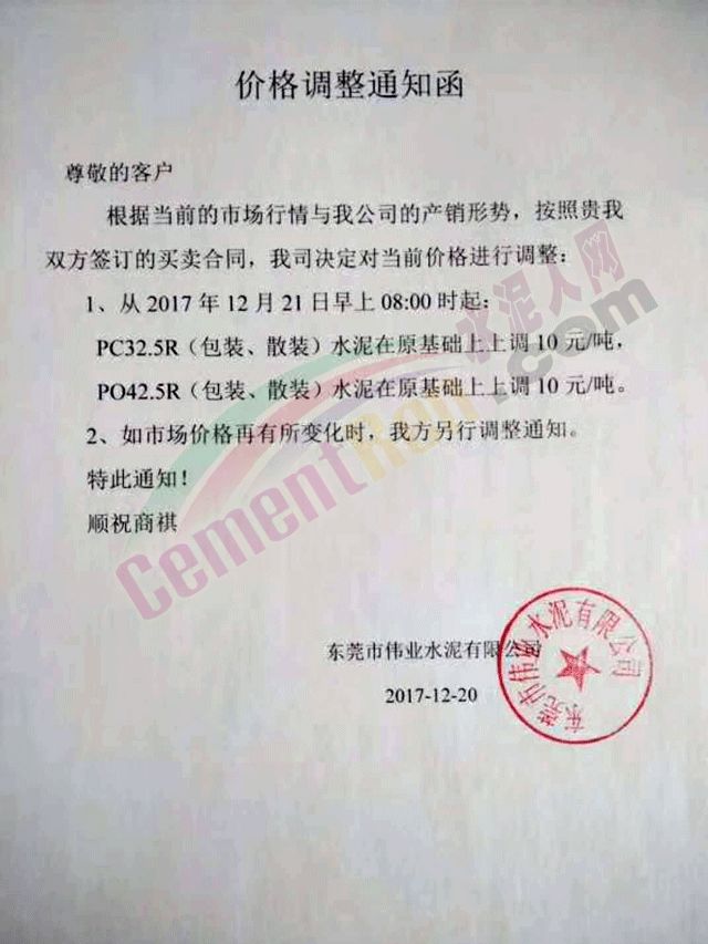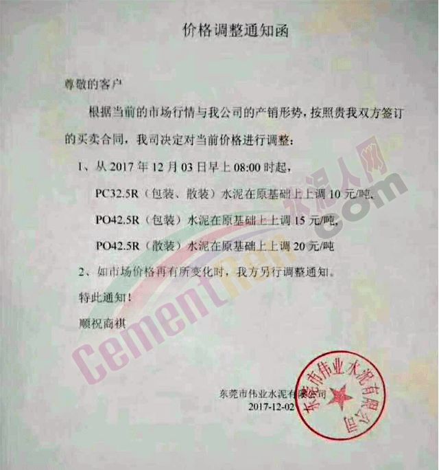 據(jù)水泥人網(wǎng)了解,廣東東莞市偉業(yè)水泥有限公司近七天內(nèi)三次上調(diào)水泥價格。其中PC32.5R袋裝、散裝水泥七天共漲價50元/噸;PO42.5袋裝、散裝水泥七天共漲60元/噸。