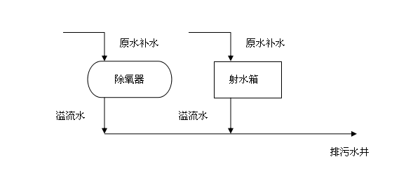 甘肅金泥集團有限責(zé)任公司干法二廠余熱電站總投資2800萬元,投產(chǎn)以來每年新增利潤數(shù)萬元,節(jié)約標(biāo)準(zhǔn)煤1.074萬噸,減排二氧化碳2.58萬噸。該余熱電站將原水通過活性炭過濾器及多介質(zhì)過濾器降低水體的濁度、除去懸浮雜質(zhì)、凈化水質(zhì),再經(jīng)過反滲透系統(tǒng)除去水中的微粒、有機物質(zhì)、膠體物和無機的陽離子、陰離子等水中雜質(zhì),進而得到除鹽水,再由物理除氧方式將其中氧氣剝離打進鍋爐,經(jīng)高溫廢氣加熱至過熱蒸汽帶動汽輪發(fā)電機做功發(fā)電,做功后的蒸汽再經(jīng)過循環(huán)水冷凝除氧進入鍋爐,如此往復(fù)形成一個汽水循環(huán)。要保證其穩(wěn)定運行,就需要將其中每一個環(huán)節(jié)做得一絲不茍,但面對北方水質(zhì)偏硬的現(xiàn)實問題,為了將循環(huán)水的硬度降至標(biāo)準(zhǔn)值不得不加大補水排污量,可是這樣又造成了不必要的水資源浪費,故對余熱電站內(nèi)除氧器及射水箱的工業(yè)補水溢流水進行了下圖所示的回收水系統(tǒng)改造。