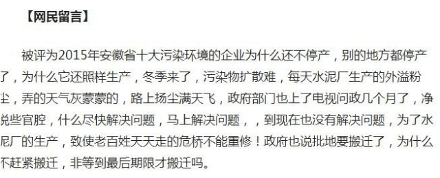被評(píng)為2015年安徽省十大污染環(huán)境的企業(yè)為什么還不停產(chǎn),別的地方都停產(chǎn)了,為什么它還照樣生產(chǎn),冬季來(lái)了,污染物擴(kuò)散難,每天水泥廠生產(chǎn)的外溢粉塵,弄的天氣灰蒙蒙的,路上揚(yáng)塵滿天飛,政府部門也上了電視問(wèn)政幾個(gè)月了,凈說(shuō)些官腔,什么盡快解決問(wèn)題,馬上解決問(wèn)題,,到現(xiàn)在也沒有解決問(wèn)題,為了水泥廠的生產(chǎn),致使老百姓天天走的危橋不能重修!政府也說(shuō)批地要搬遷了,為什么不趕緊搬遷,非等到最后期限才搬遷嗎。