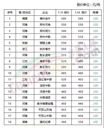各區(qū)域企業(yè)PO42.5散裝水泥出廠報(bào)價(jià)(降價(jià)企業(yè))